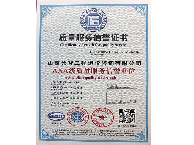 質(zhì)量服務(wù)信譽(yù)證書
